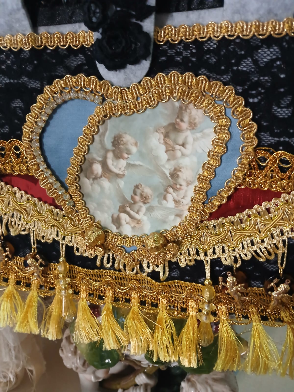 Borsa decorata a mano con motivo angelico, pizzo e passamaneria