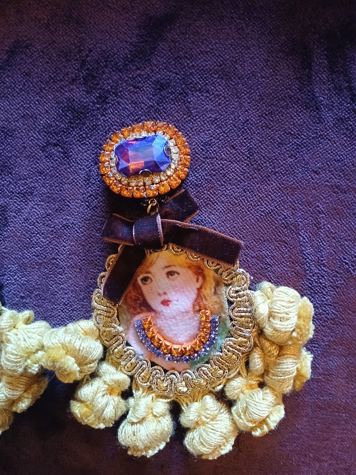 Motivo centrale cherubino circondato da passamaneria dorata, adornato da strass, e nappine che circondano lo stesso.
