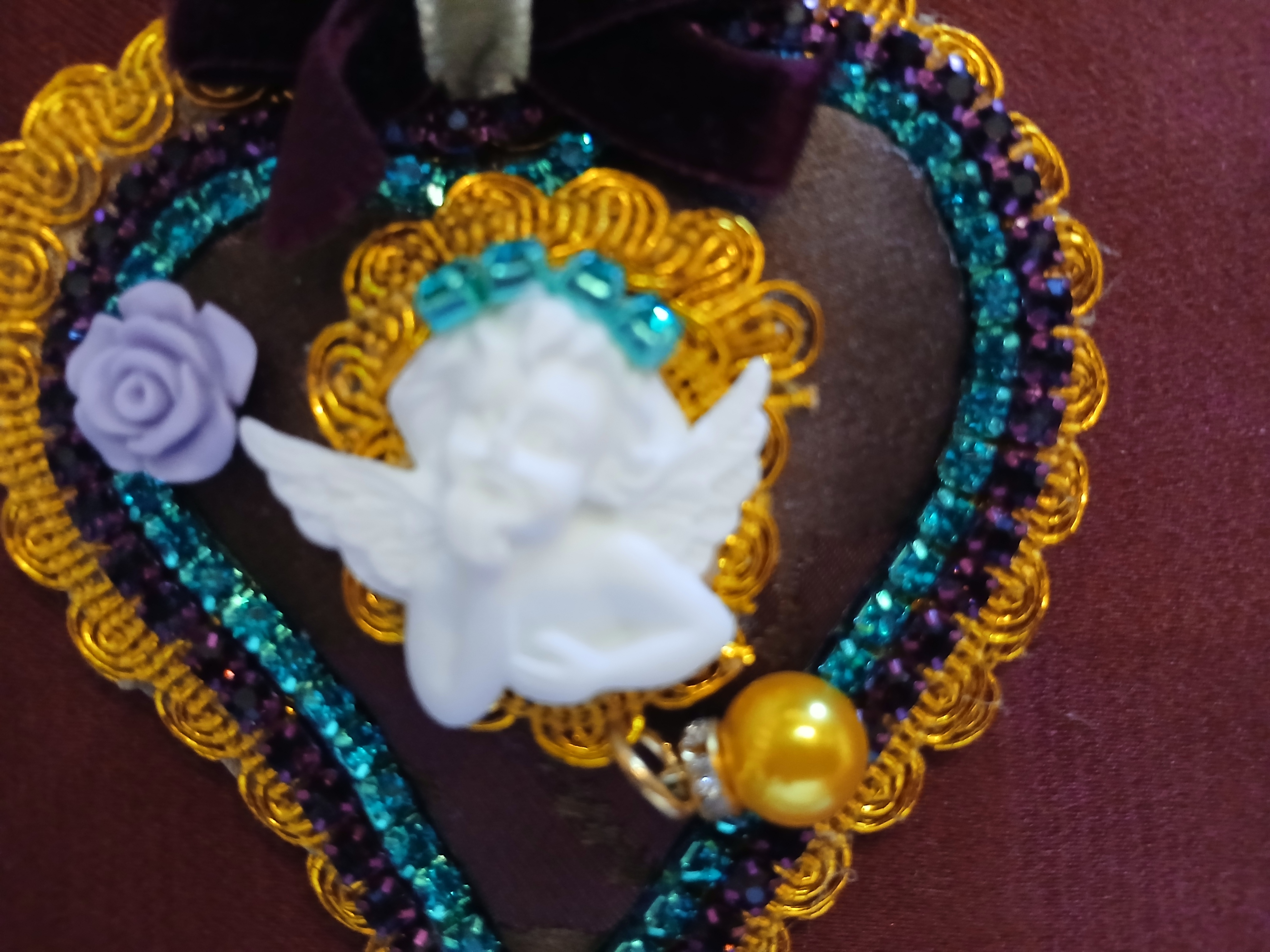 GRANDI ORECCHINI A FORMA DI CUORE con motivo centrale, angioletto in resina, applicato su cuore bombato.