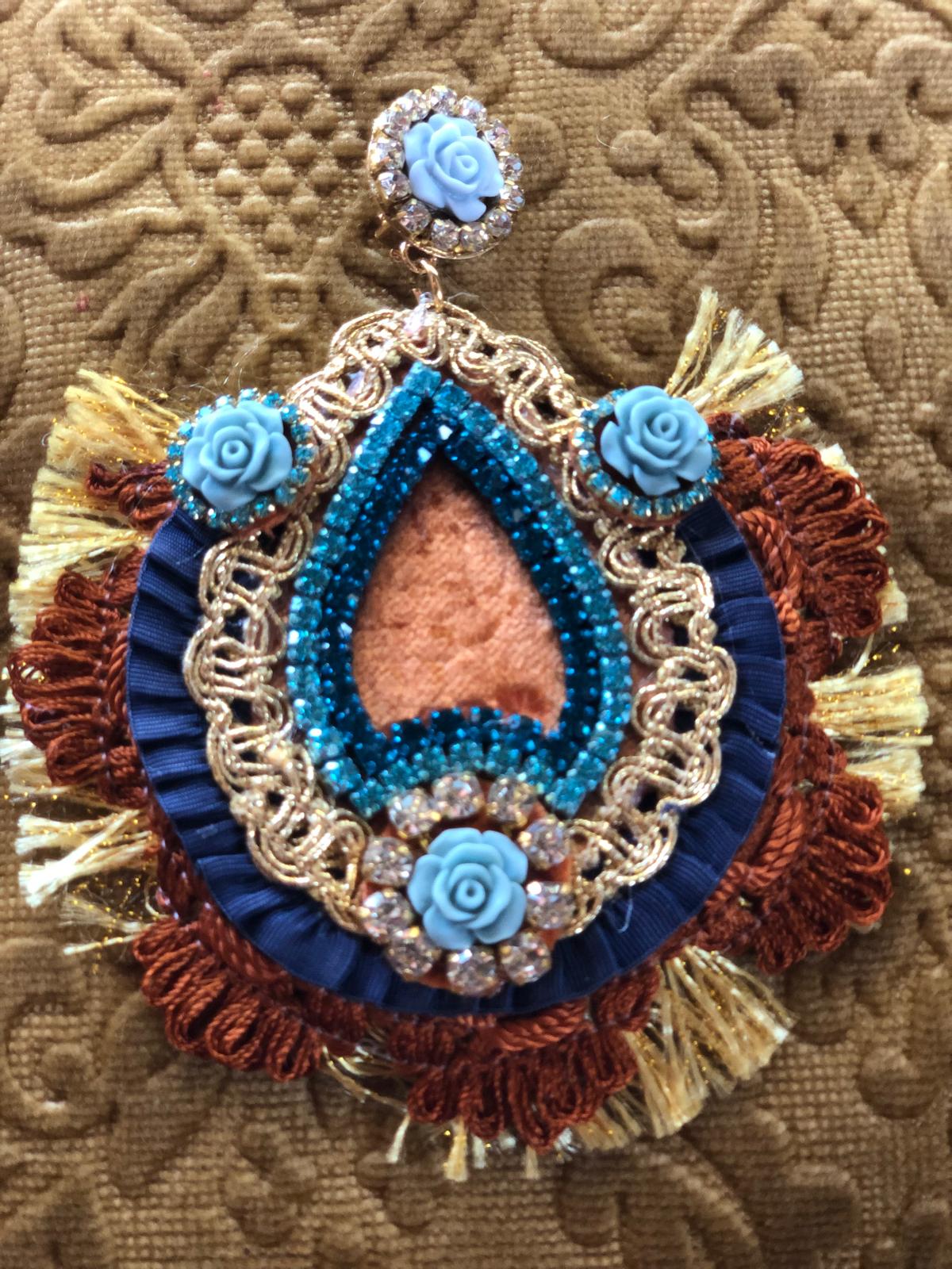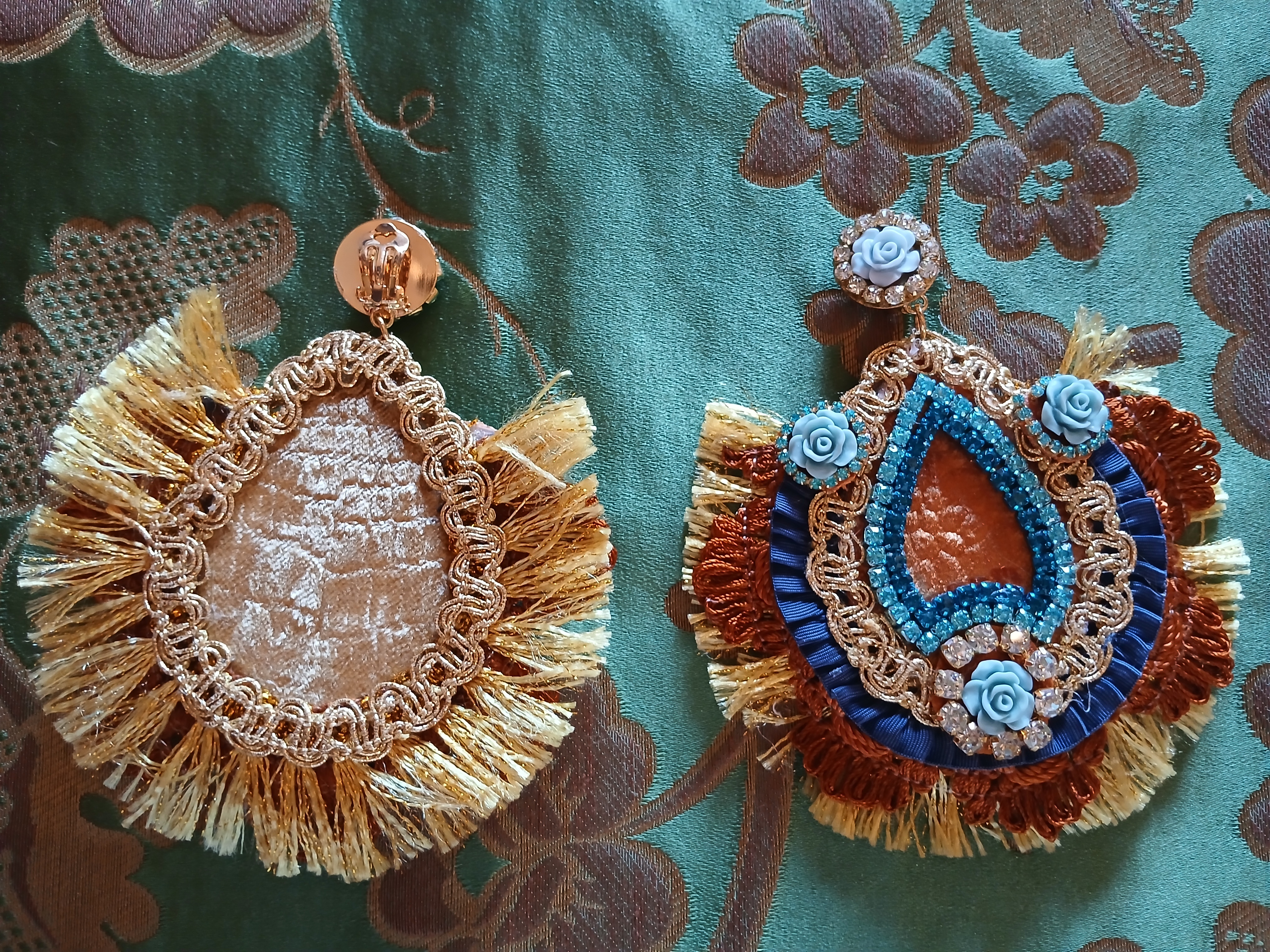 Particolari orecchini in tessuto lavorato.Un mix di colori e materiali.Velluto color terra bruciata, passamaneria dorata, bordino blu, passamaneria color terra bruciata e oro.