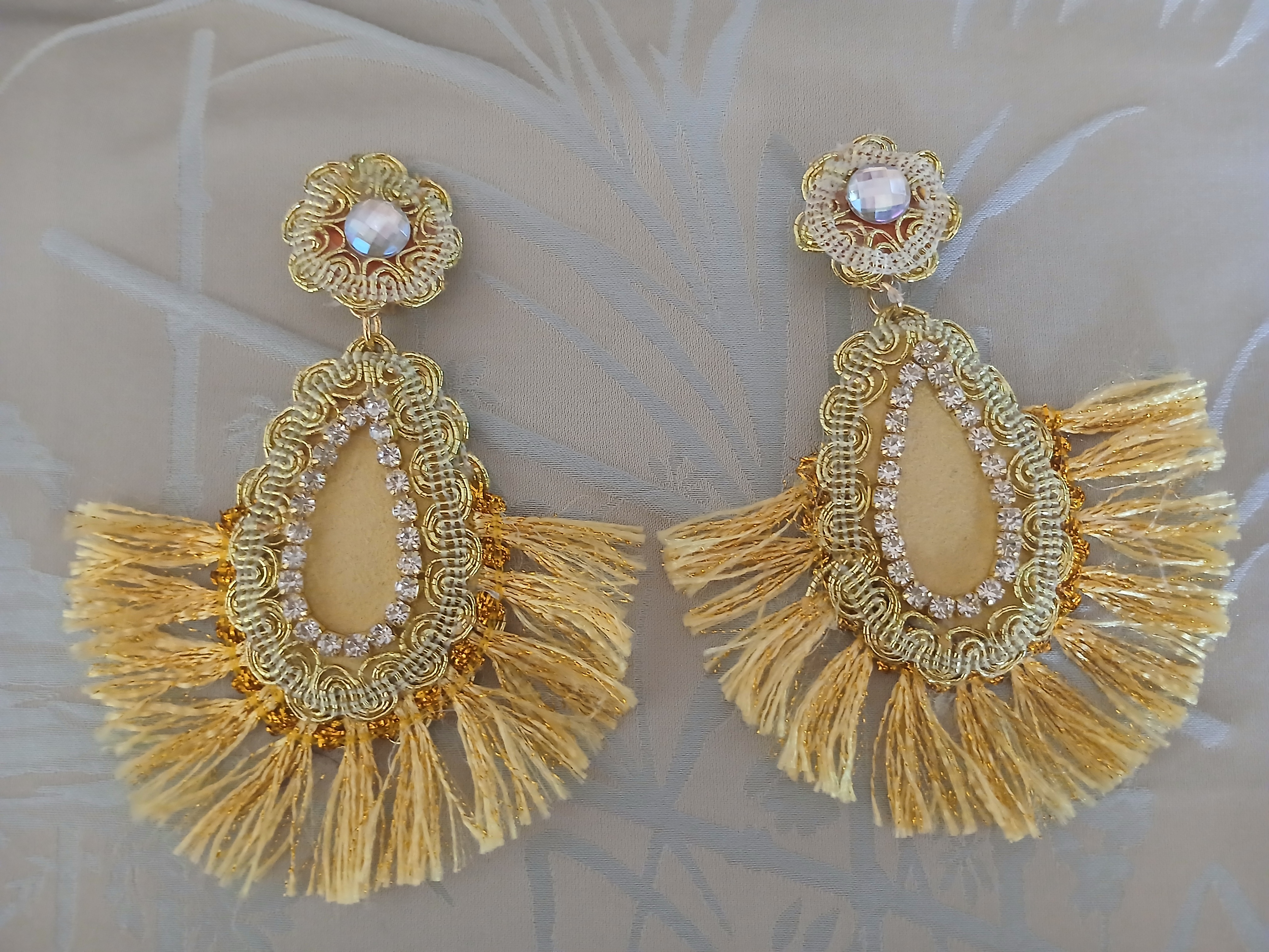 Passamaneria color oro montata a ventaglio intono alla goccia decorata con catena strass.