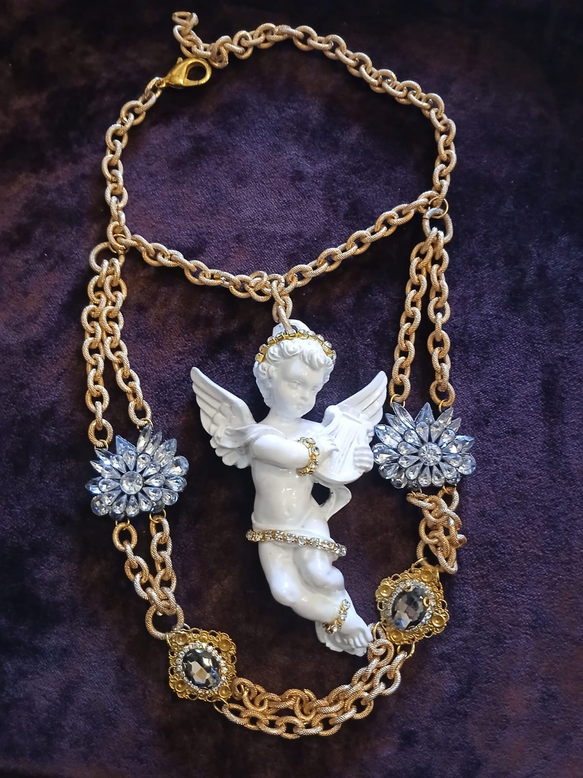 Chiara e splendente come una giornata di luce, questa splendida collana che vede come protagonista un superbo e grande cherubino decorato con catene strass nella parte della testolina, del braccio della caviglia e della vita, posizionato al centro del gioiello e raccolto da meravigliose catene color oro.