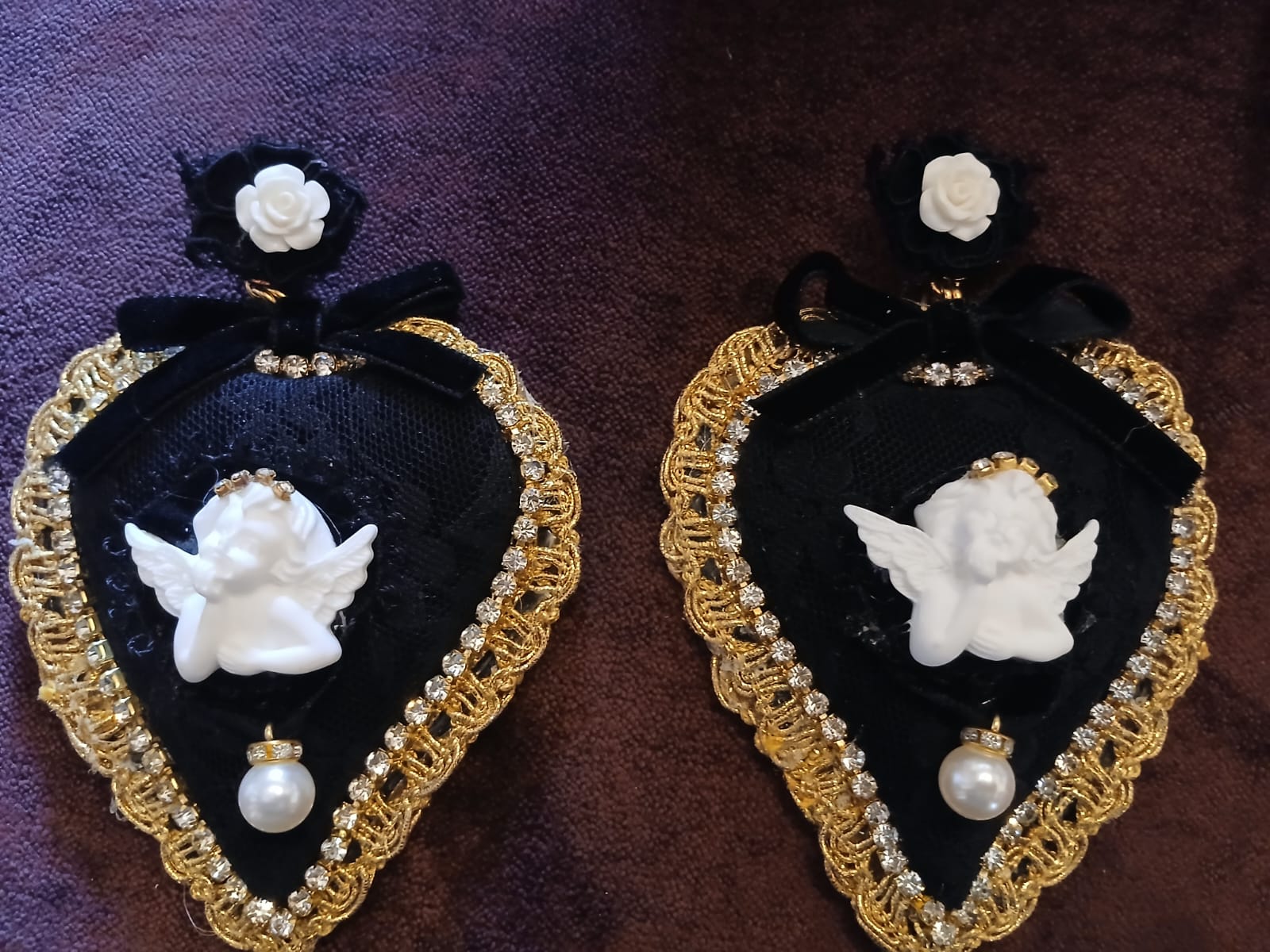 Bellissimo orecchino a forma di cuore bombato realizzato interamente a mano con angeletto in resina al centro.