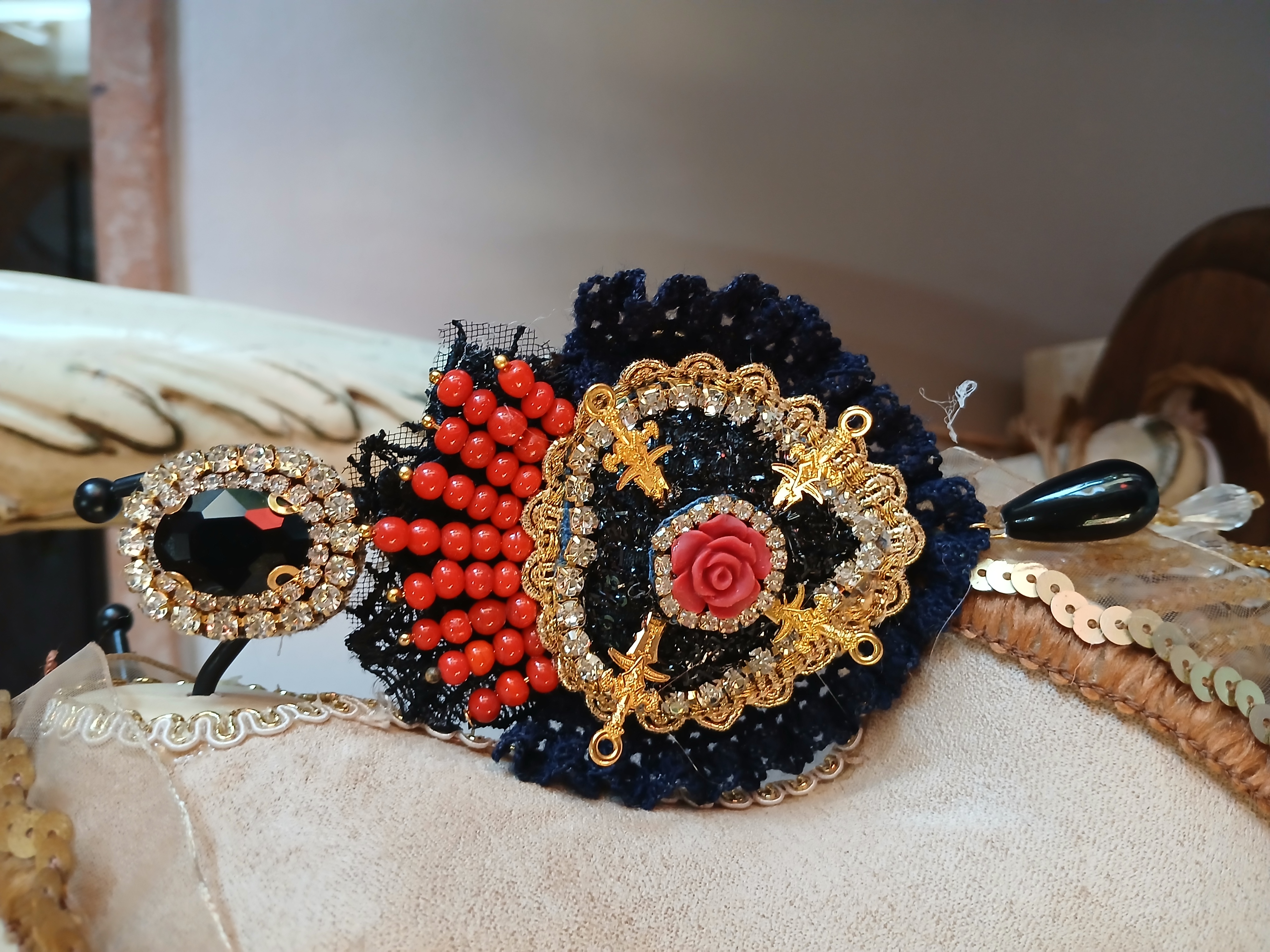 Pizzo blù notte nella parte che circonda il cuore, nero nella parte alta e passamaneria dorata.