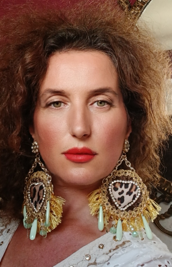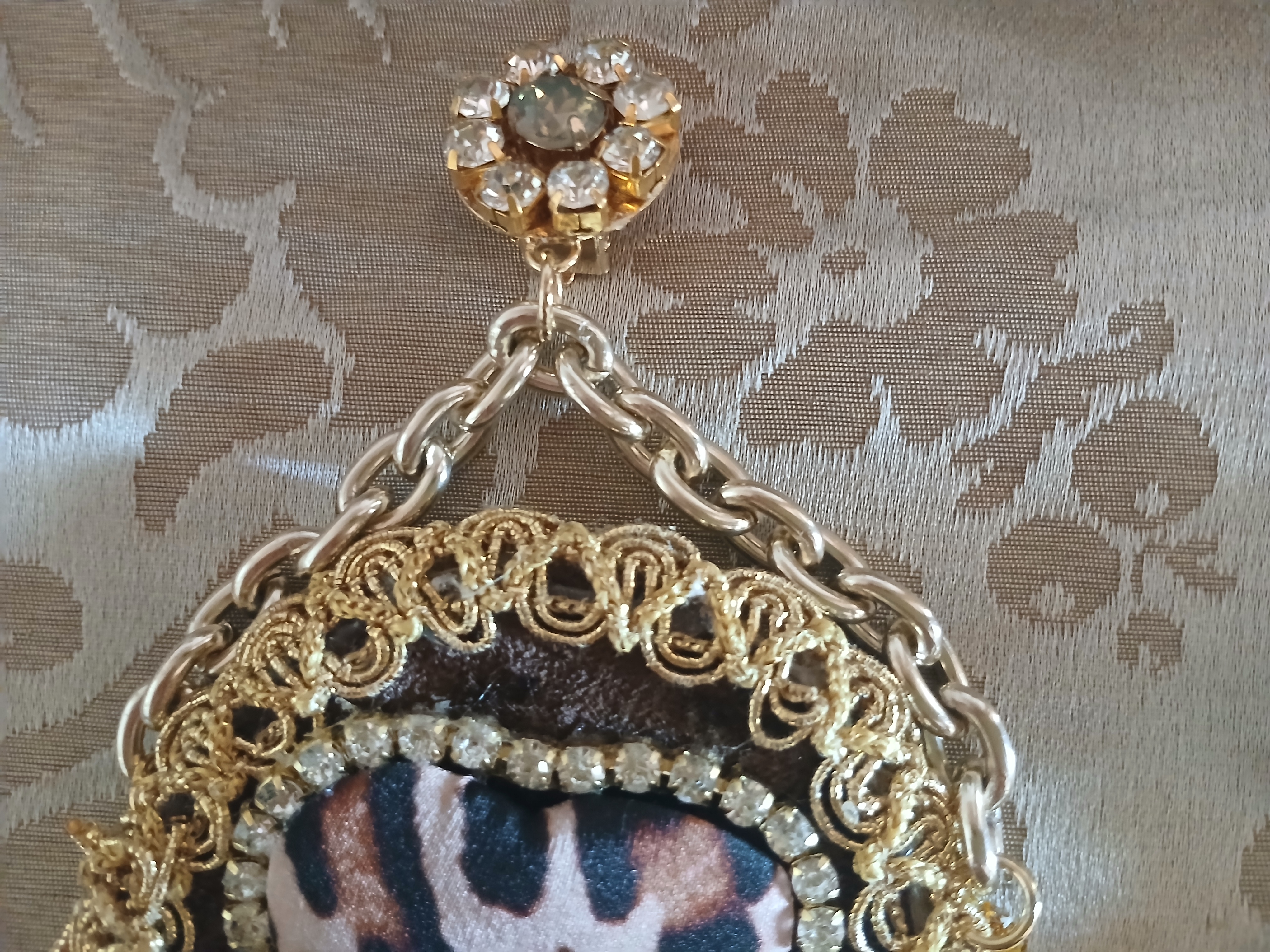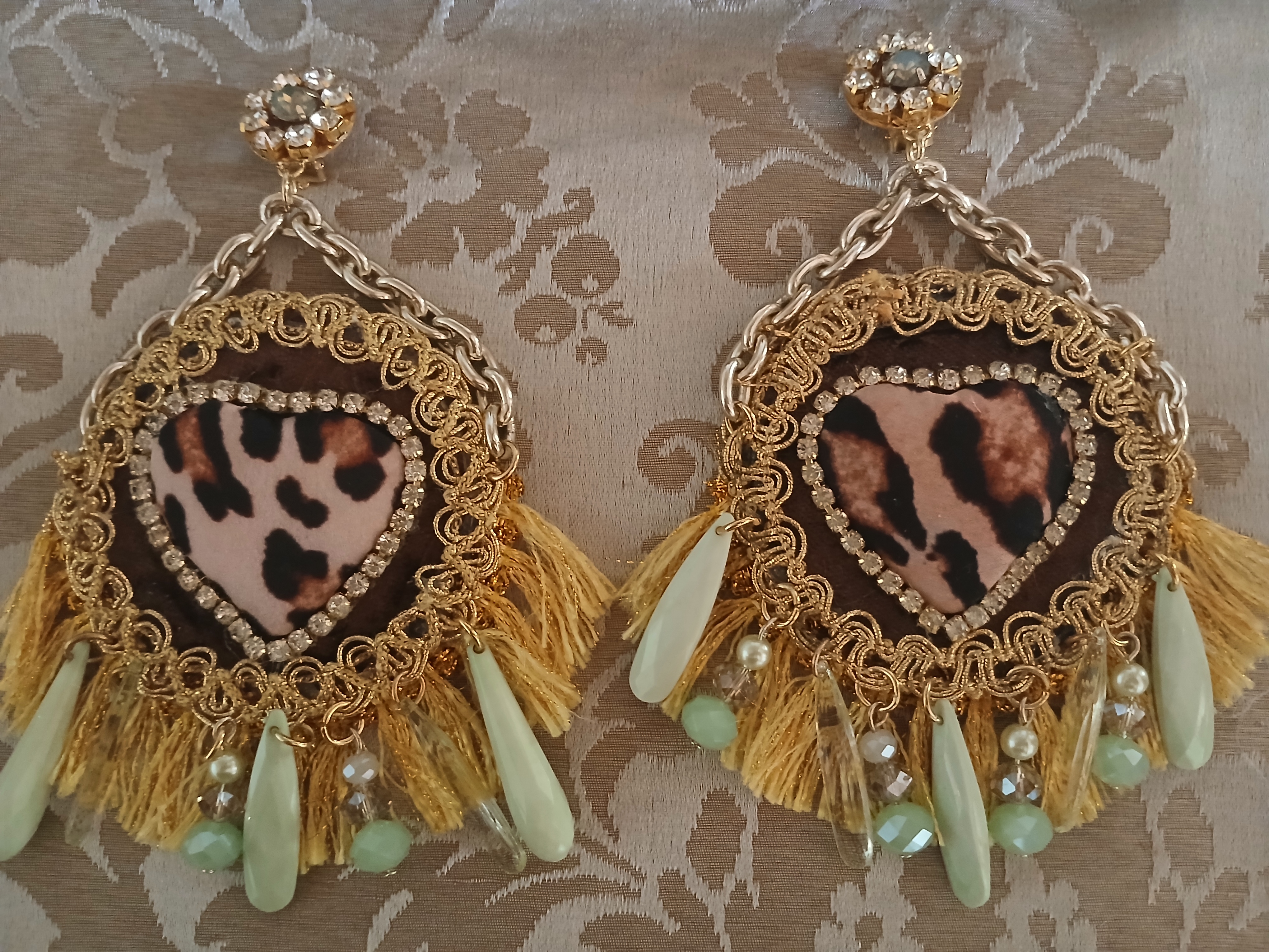 Grandi orecchini con cuori centrali leopardati realizzati in stoffa, passamaneria montata a ventaglio con goccie in resina color verde acqua e catene che collegano il centrale alla clip decorata con strass abbinati.