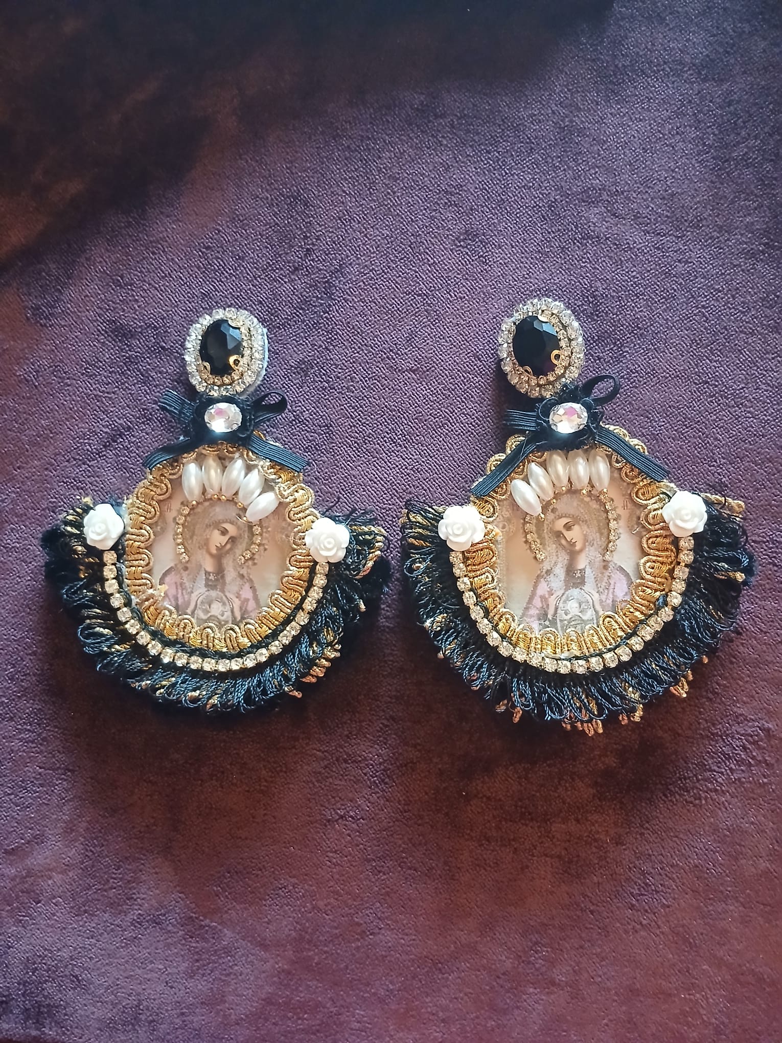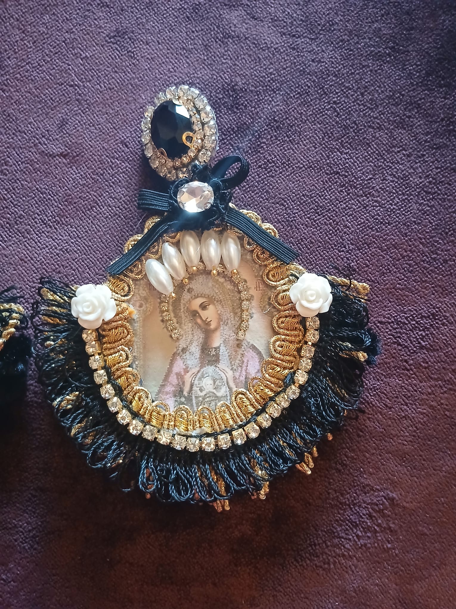 Meravigliosi orecchini con vergine Maria nella parte centrale