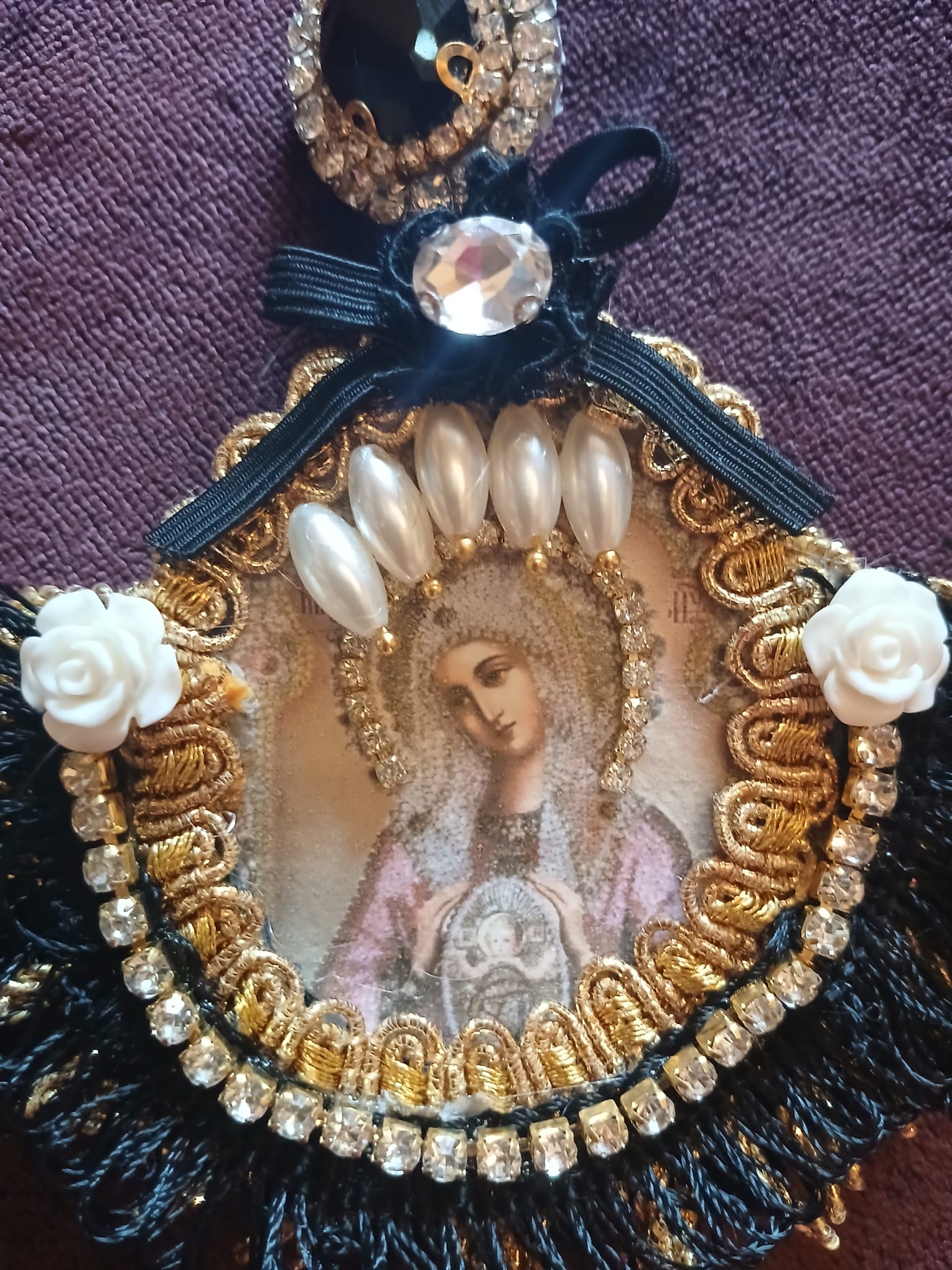 Orecchino dal carattere grintoso, relizzato in tonalità noir, passamanerie di varia natura e colori con Vergine Maria nella parte centrale.