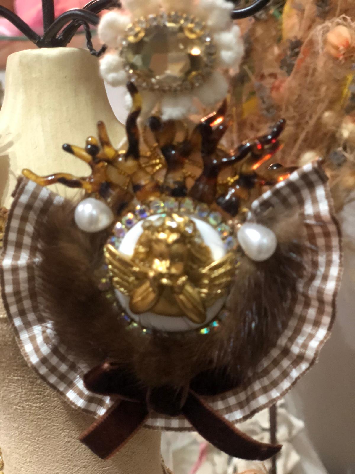 Putto color oro con coroncina nella parte centrale, cresta con rametti di corallo animalier nella parte alta e due perline bianche ai lati.