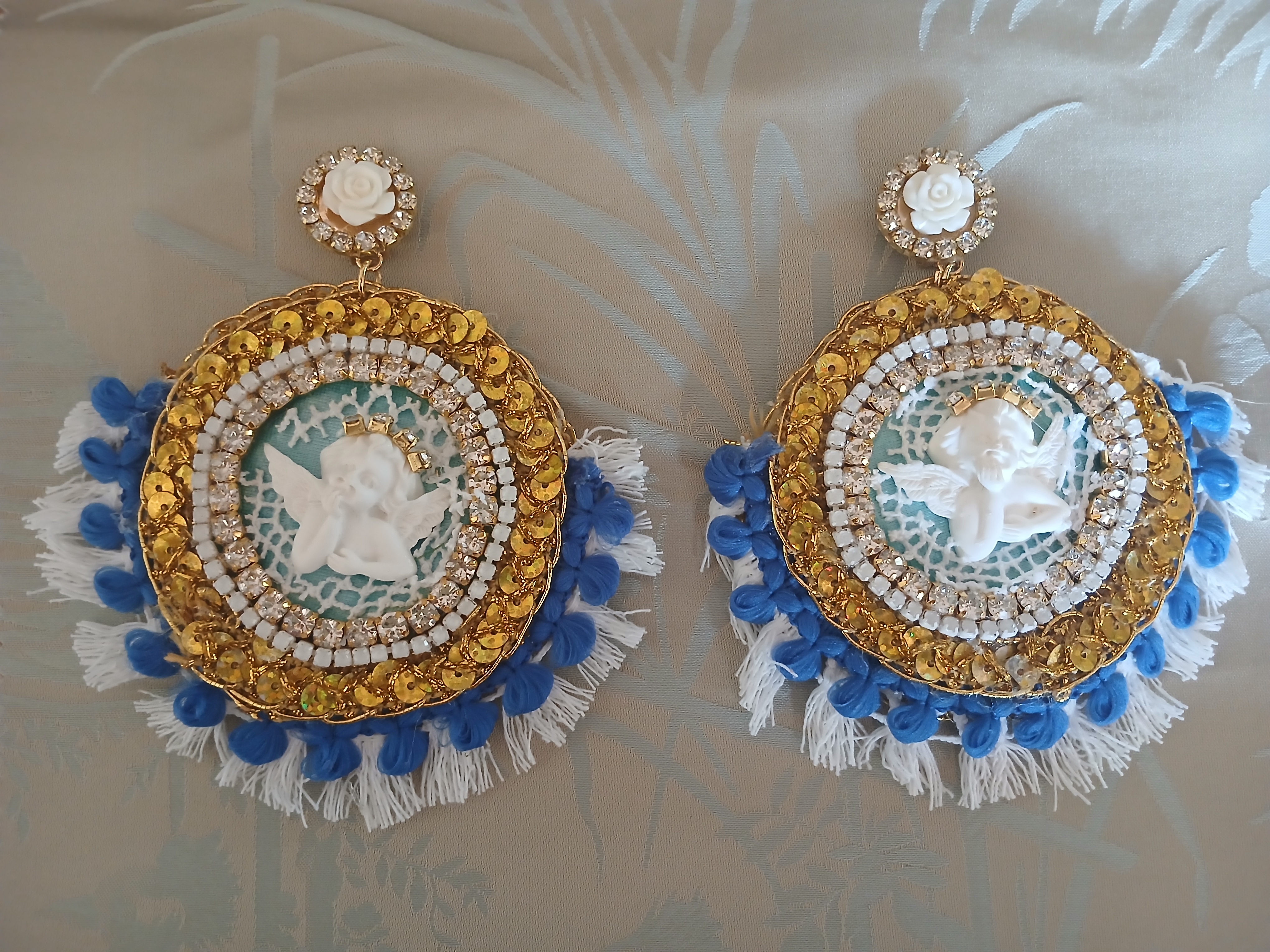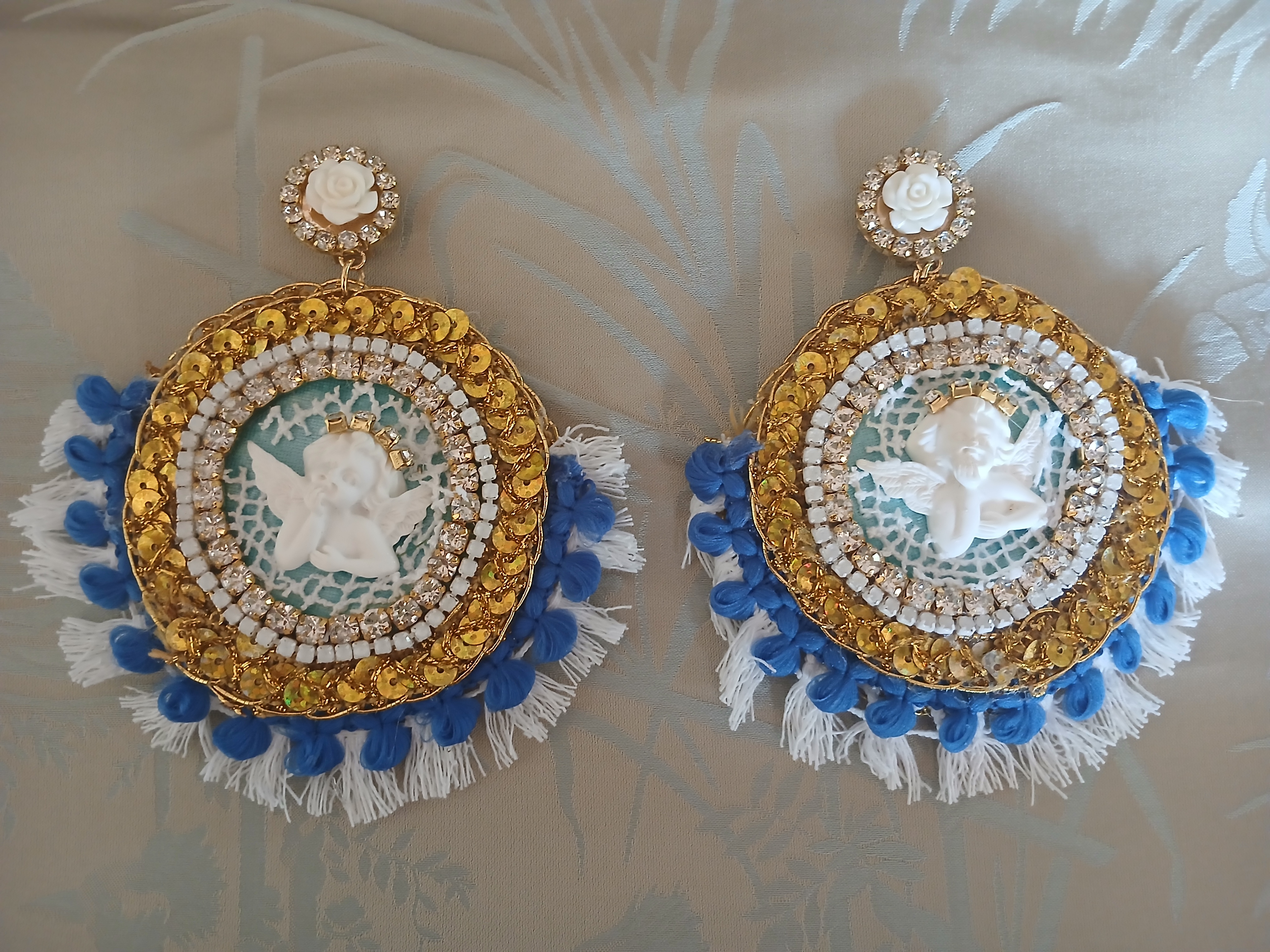 BELLISSIMO ORECCHINO FORMA TONDA con passa, aneria dorata, e blu.